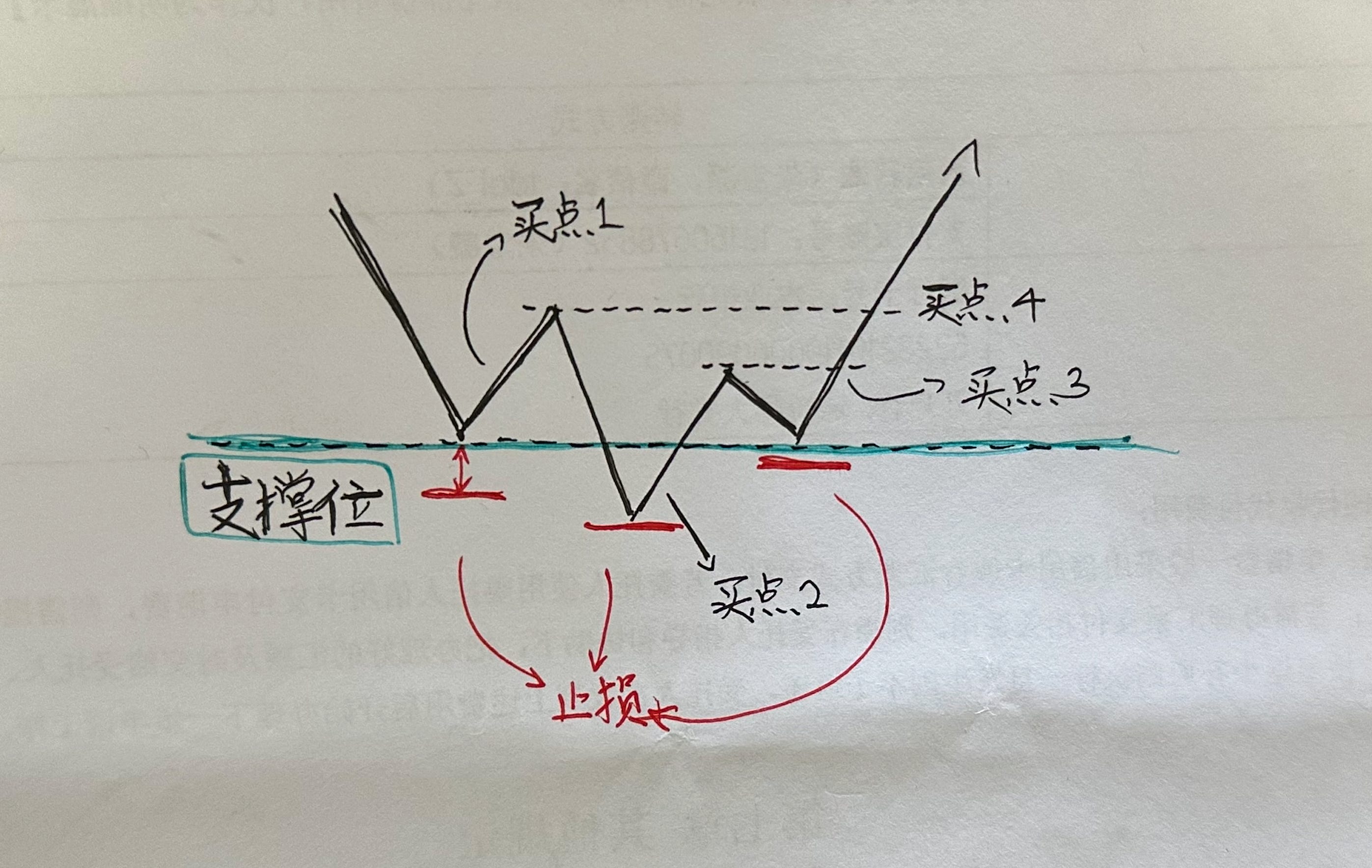比如下图,如果你在买点2介入,你可以设置止损在最低点。而随着股价上涨,到达买点3的时候,我们就可以加仓,并把止损移动到第三个止损点位(第三根红线)。而此时,前面那个止损点就成了pivot low