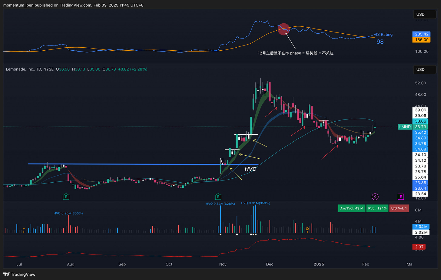 而12月之后,LMND见顶回调,退出了rs phase(最上面的那个红色点🔴)。