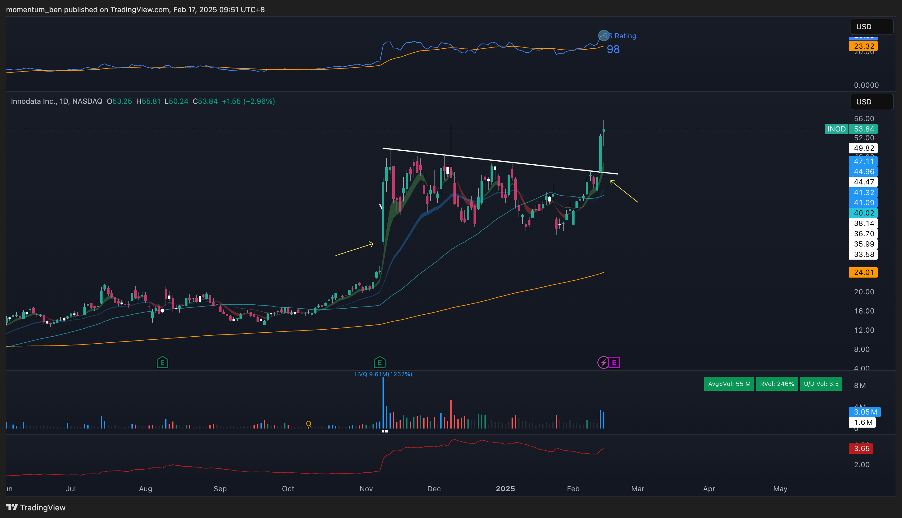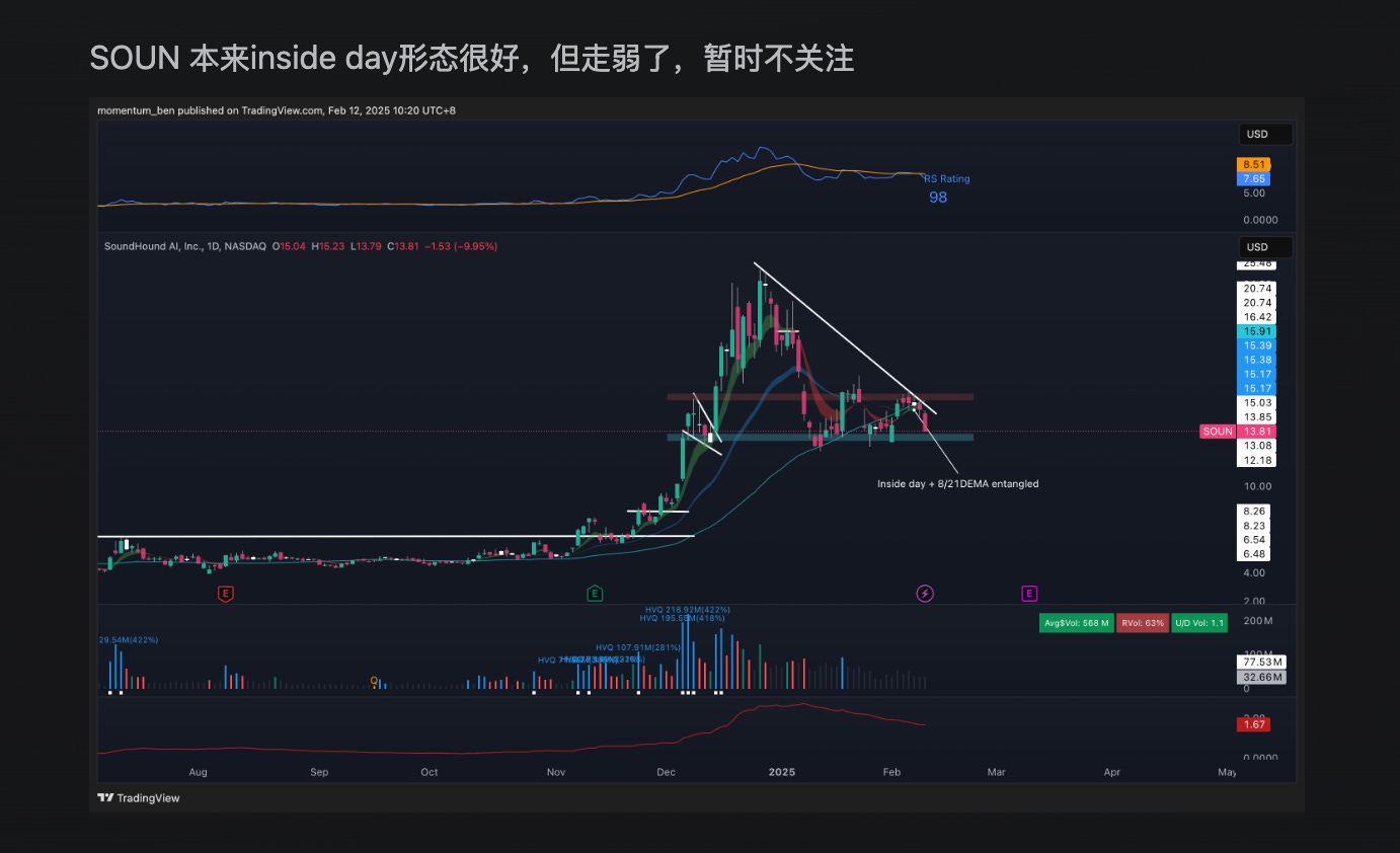 比如上周我十分看好的SOUN。它出现了inside day,均线缠绕,价格紧凑,形态很不错。但它没有触发我们的买点,并且走坏了形态,所以我们也不用去关注它。