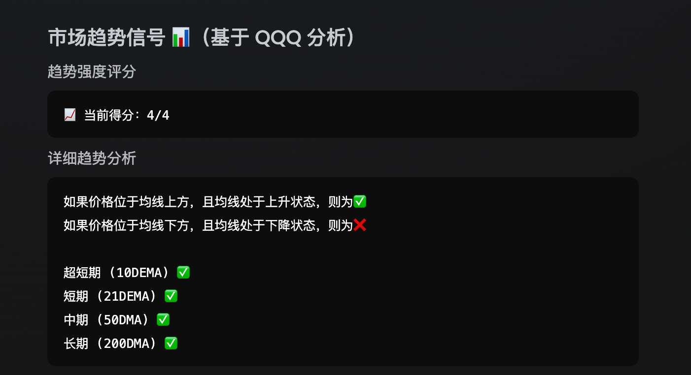 下一个是市场的趋势信号,这个也很好理解,主要就是解读QQQ的价格和均线之间的位置。我希望在趋势评分为3-4分的时候积极去交易和操作,在趋势评分转为3分的时候开始谨慎。