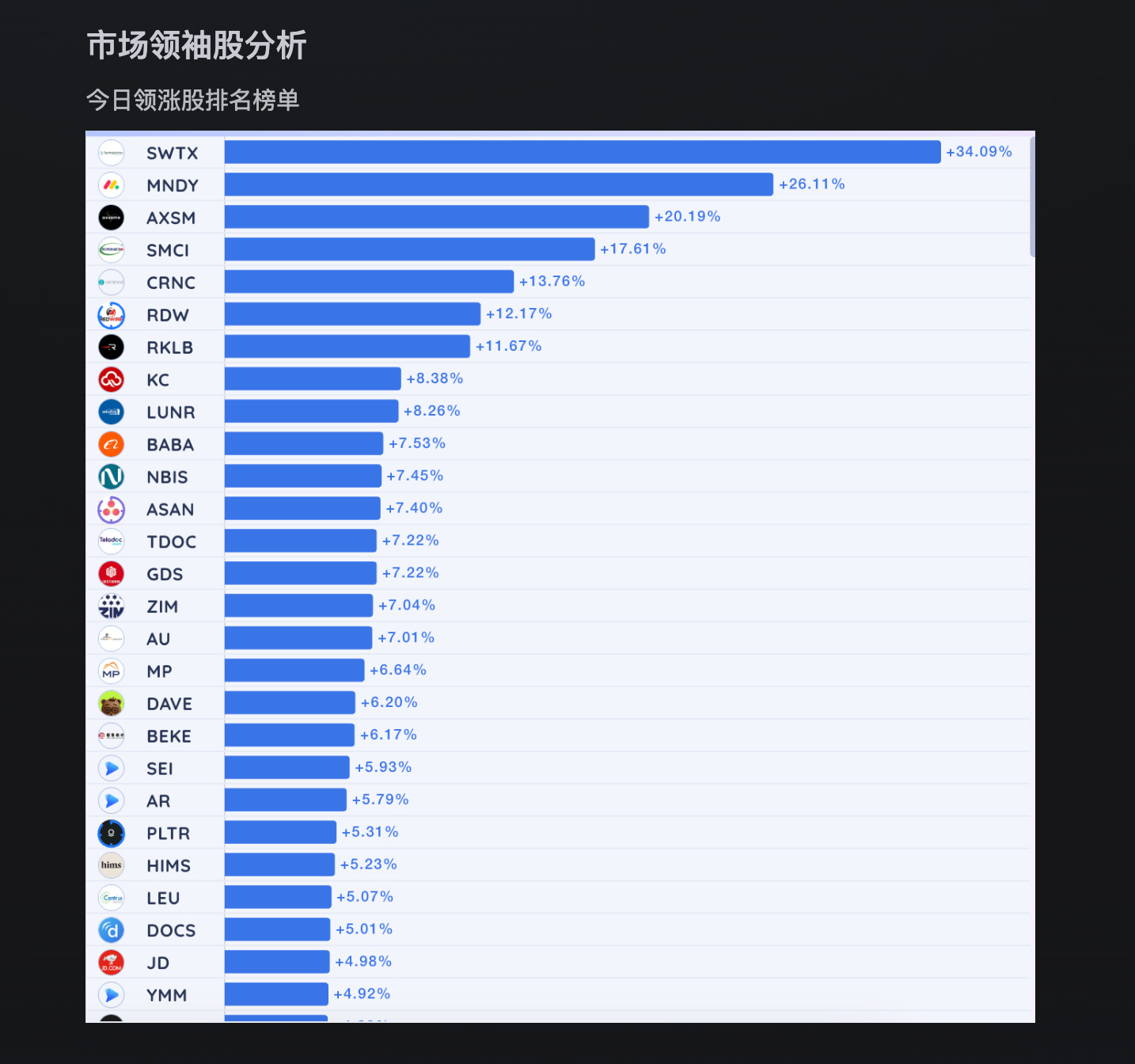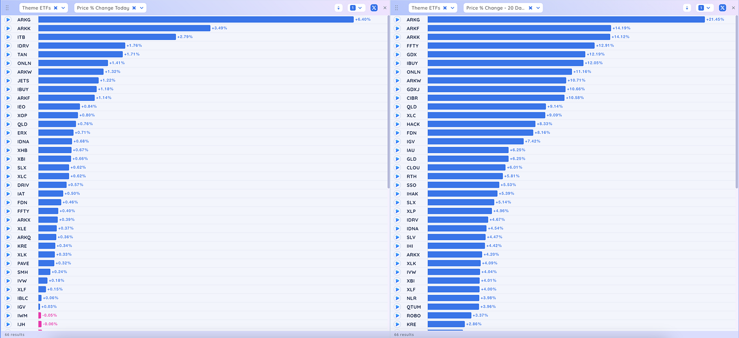 下面这张横向柱状图是每一个题材板块指数的表现,比如比特币指数IBIT,软件指数IGV,科技指数ARKK,观察他们的表现有助于我了解当前市场的强势板块,因为做波段交易就是要抓住最强势的板块,交易里面的强势股。