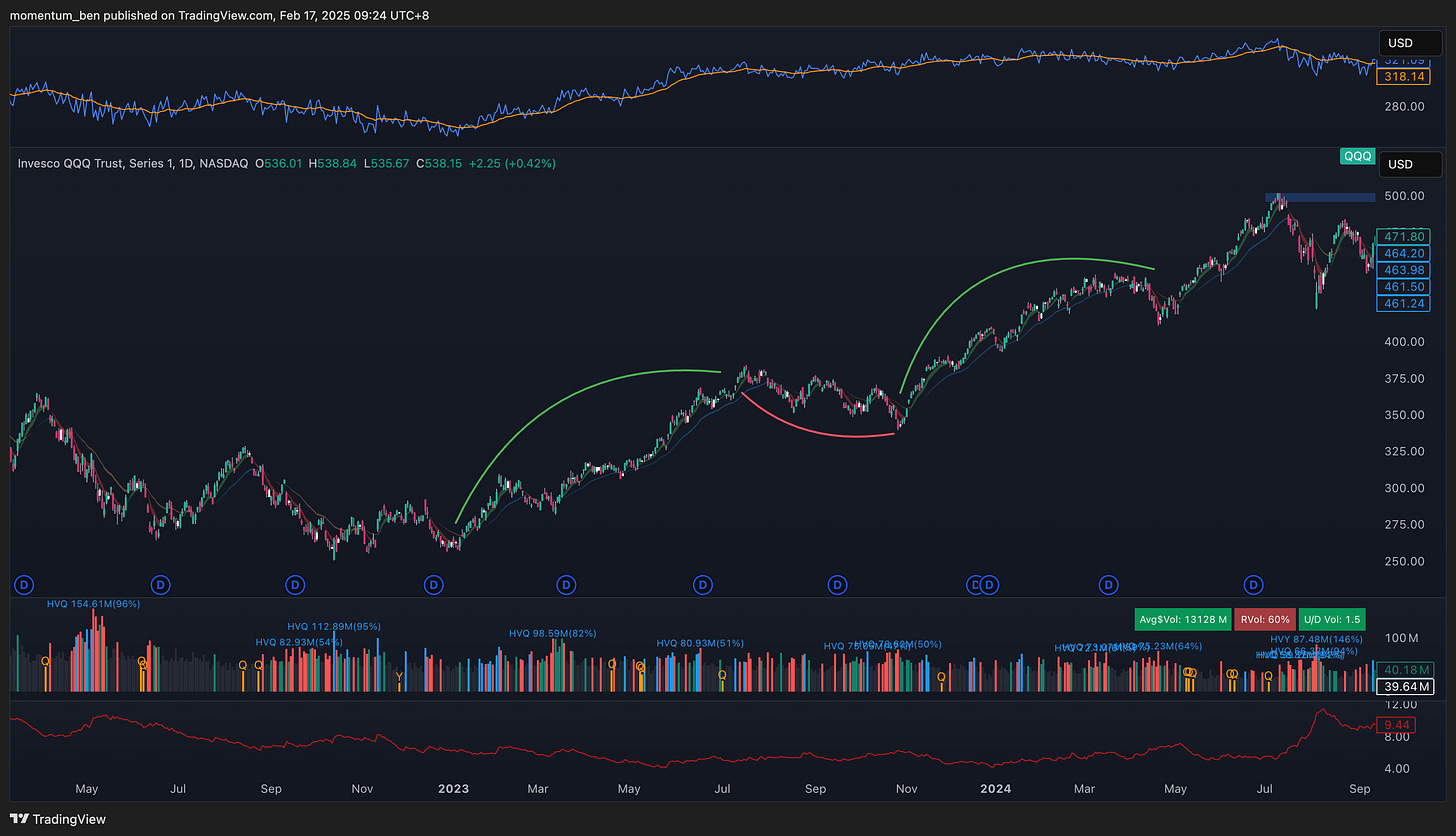 下图是QQQ在2023年1月份到2024年4月份的表现。绿色区间属于市场环境优越的时候,适合我们踩油门,积极做交易;而红色区间属于市场环境差和不明朗的时候,适合我们观望,不要太过于激进。